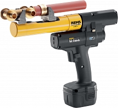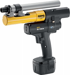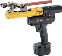 - REMS Акс-Пресс 25 ACC базовый пакет. Аккумуляторный, аксиальный пресс для изгото вления соединений с натяжной гильзой Ø 12 – 40 мм. Ход 40 мм, для запрессовки натяжных соединений с межосевым расстоянием ≤ 82 мм. Для привода обжимных головок. Электрогидравлический привод с аккумуляторным двигателем, 14,4 В, 420 Вт, планетарным редуктором, эксцентриковым поршневым насосом и компакт ной мощной гидравлической системой. Переключатель безопасности. Встроенный рабочий светодиодный светильник. Аккумулятор Li-Ion 14,4 В, 1,6 Aч, быстрозарядное устройство Li-Ion/Ni-Cd 230 Вт, 50 – 60 Гц, 65 Вт. Без пресс-головок. В прочном стальном чемодане