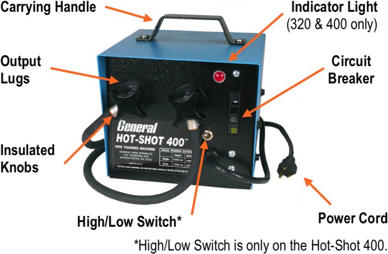 Аппарат для разморозки труб General Pipe Cleaners Дракон 400 (Дженерал Пайп Клинерс Hot Shot 400) предназначен для экстренного разогрева труб Ø 12 – 40 мм (1/2" – 1 1/2") и более, длиной 12 м и более, для удаления ледяных пробок. За считанные минуты удалит ледяную пробку в отрезке трубы длиной до 60 м.