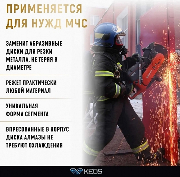 Диск алмазный универсальный Keos Professional 230 мм (Кеос Профессионал 230 мм) предназначен для резки металлов, пластика, резины, бетона, армированного бетона (железобетона), кирпича, древесины и т.д. ушм (болгарками), штроборезами, бензорезами, электрическими резчиками и плиткорезами, стенорезными машинами, как с подачей воды, так и всухую. Подходит для универсального использования, аварийно-спасательных работ и многого другого.