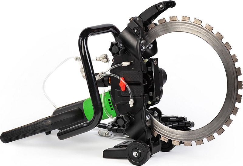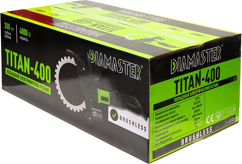 Электрический кольцерез по бетону Diamaster Titan-400 (Диамастер Титан-400) – профессиональный ручной электрический бесщеточный алмазный кольцевой резчик (ручная электрическая бесщеточная алмазная кольцерезная пила / стенорезная машина) для резки твердых материалов, таких, как: бетон, железобетон, кирпич, другие каменные и композитные материалы. Подходит для профессионального использования в строительстве, ремонте и демонтаже, обеспечивая высокую производительность и точность реза.