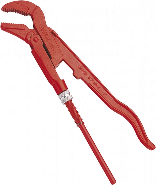 - Искривленная верхняя губка под гайку и прямая нижняя губка расположены параллельно под углом 45° к рукоятке