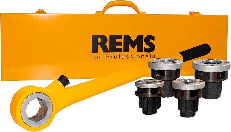 - Rems Eva Set R 1/2"-3/4"-1"-1 1/4". Ручной резьбонарезной клупп для трубной резьбы R 1/2", 3/4", 1", 1 1/4". Для правой резьбы. Один храповый рычаг для всего рабочего диапазона. Быстросменные резьбонарезные головки и плашки для правой трубной конической резьбы ISO 7-1, EN 10226 (DIN 2999, BSPT) R 1/2", 3/4", 1", 1 1/4". В прочном стальном чемодане.