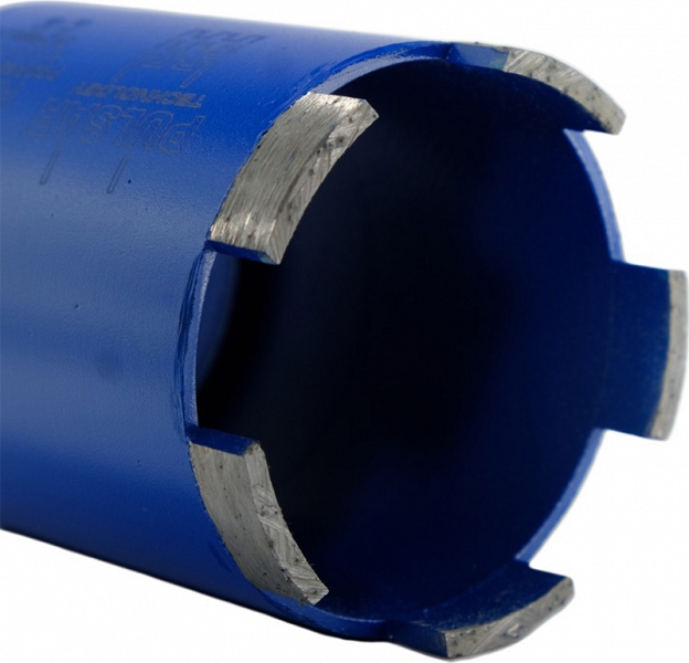 - Алмазные сегменты, приваренные к корпусу лазером, позволяют осуществлять бурение без подачи воды