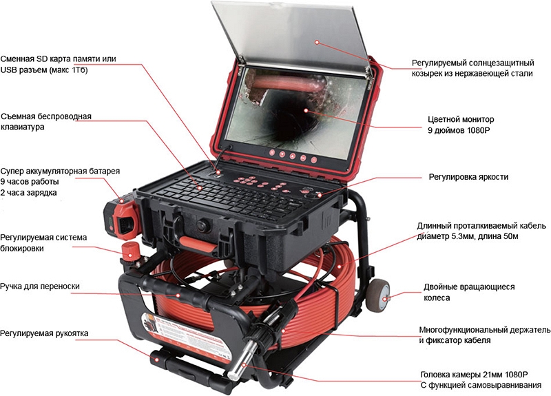- Головка камеры Ø 21 × 45 мм и проталкиваемый кабель Ø 5,3 мм × 40 м из стекловолокна со счетчиком длины и системой торможения, подходящие для труб Ø 50 – 125 мм, длиной до 40 м