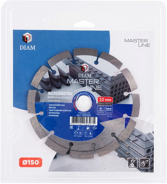Сегментный алмазный круг Diam Master Line 1A1RSS Железобетон 150 мм (Диам Мастер Лайн 1А1РСС Железобетон 150 мм) – профессиональный алмазный отрезной диск для сухой резки бетона, армированного бетона (железобетона), тротуарной плитки, кирпича, клинкера, огнеупоров и других строительных материалов, схожих по характеристикам, на углошлифовальных машинах (ушм, болгарках), штроборезах и другом оборудовании, с подачей и без подачи воды.