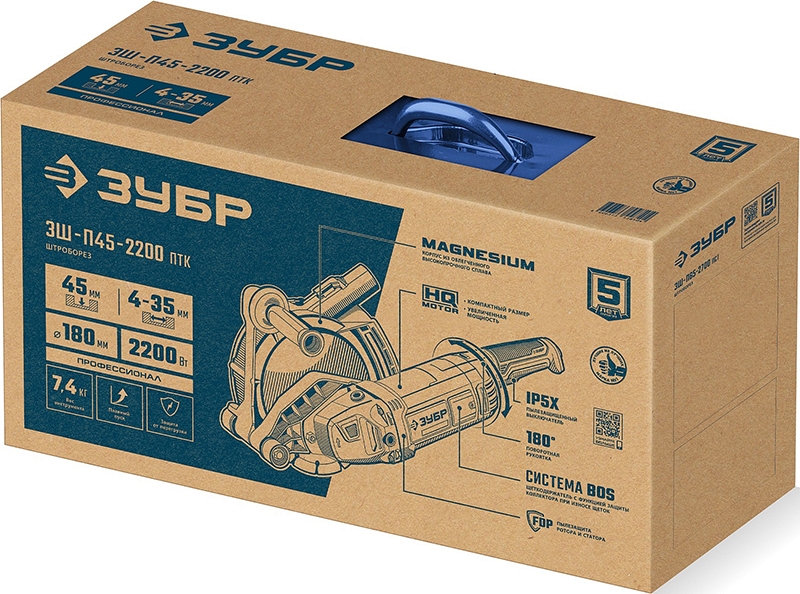Штроборез Зубр Профессионал ЗШ-П45-2200 ПТК (Zubr Professional ZSH-P45-2200 PTK) – мощная модель в серии профессиональных штроборезов ЗУБР для выполнения штроб в бетонах разных марок. Быстрый рез на глубину до 45 мм благодаря увеличенной мощности двигателя. Эффективное пылеудаление исключает простои на проветривание пыли. Облегченный вес благодаря магниевому кожуху диска. Металлический кейс для хранения и переноски.